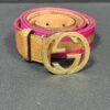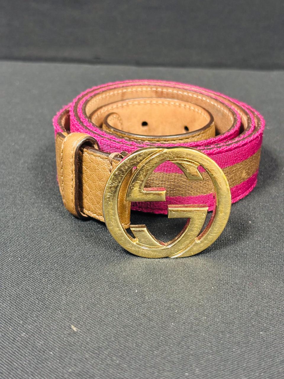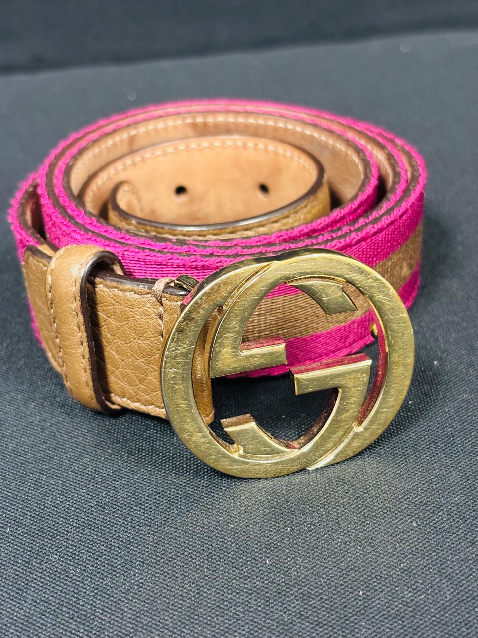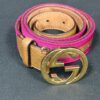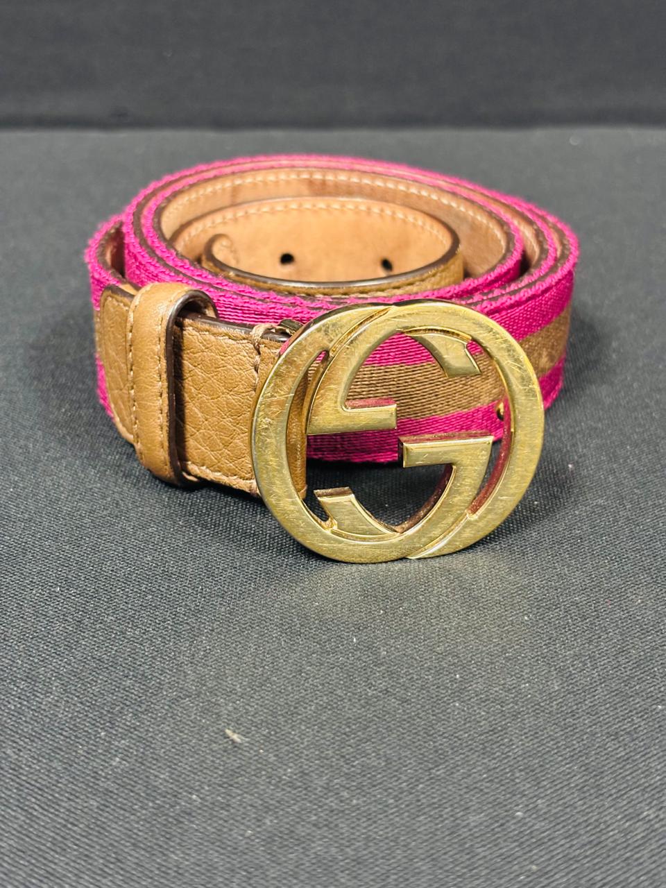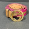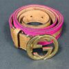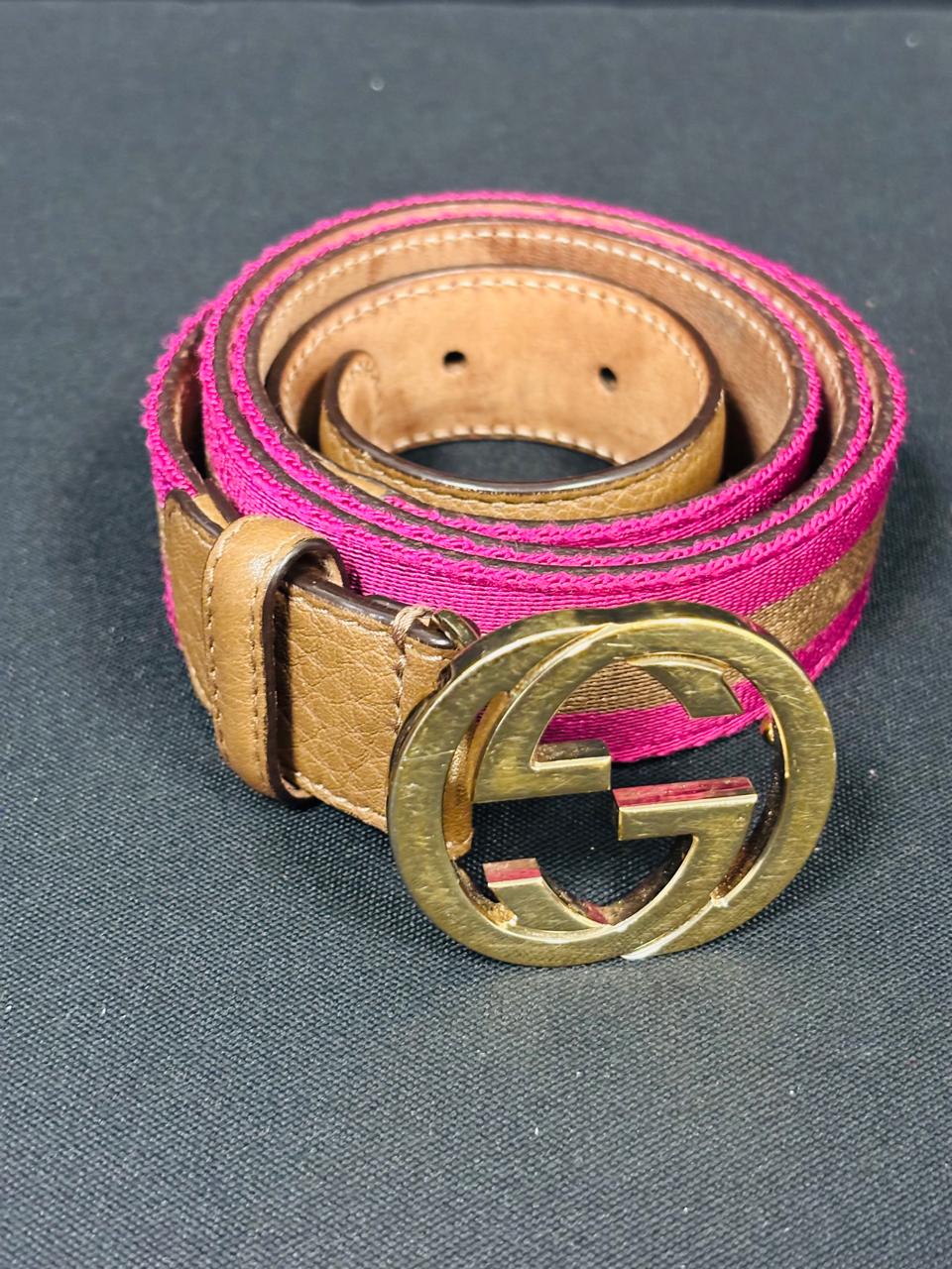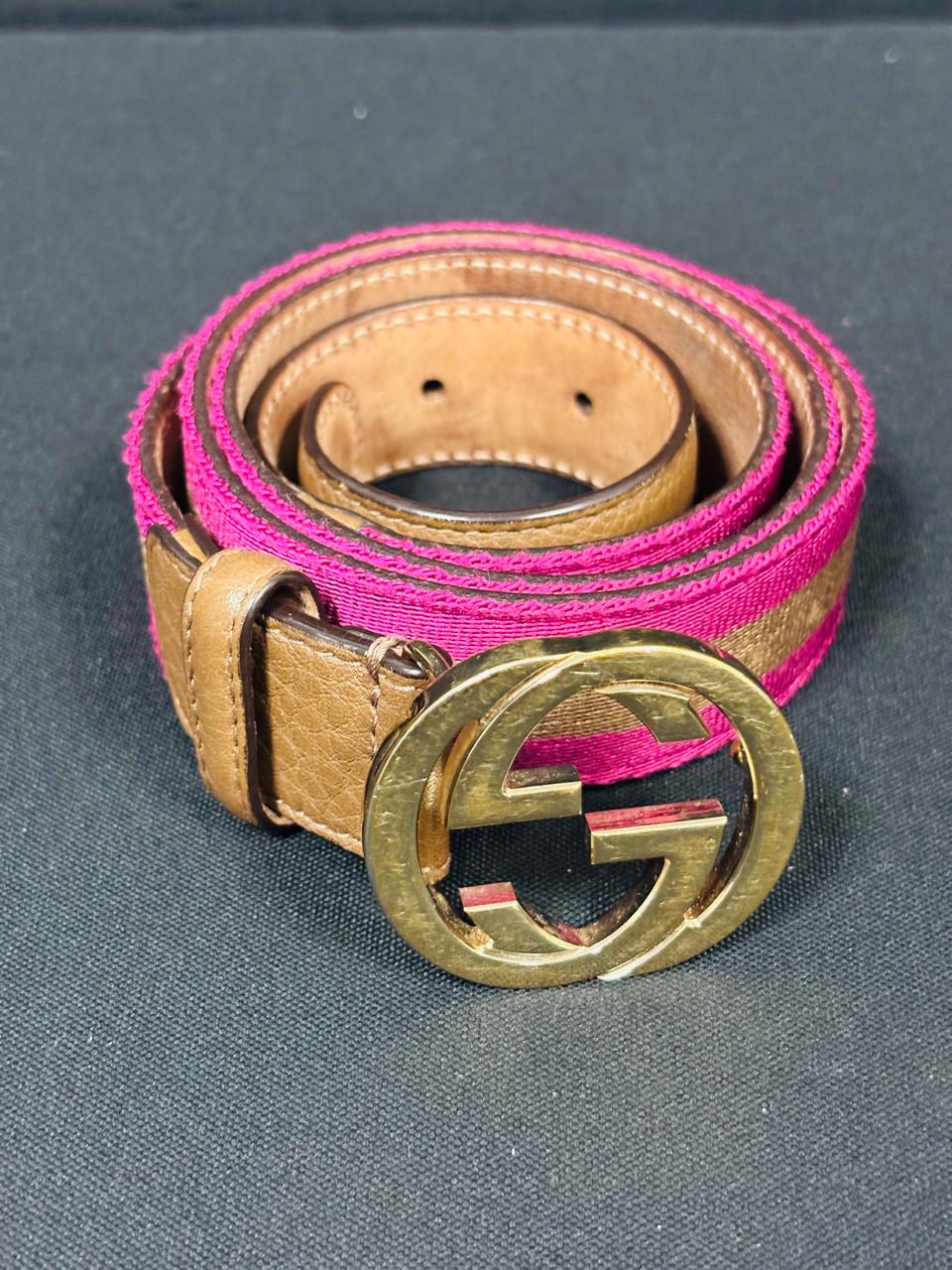 Gucci Woven Belt with Gold GG Buckle – Pink/Brown with Tan Leather